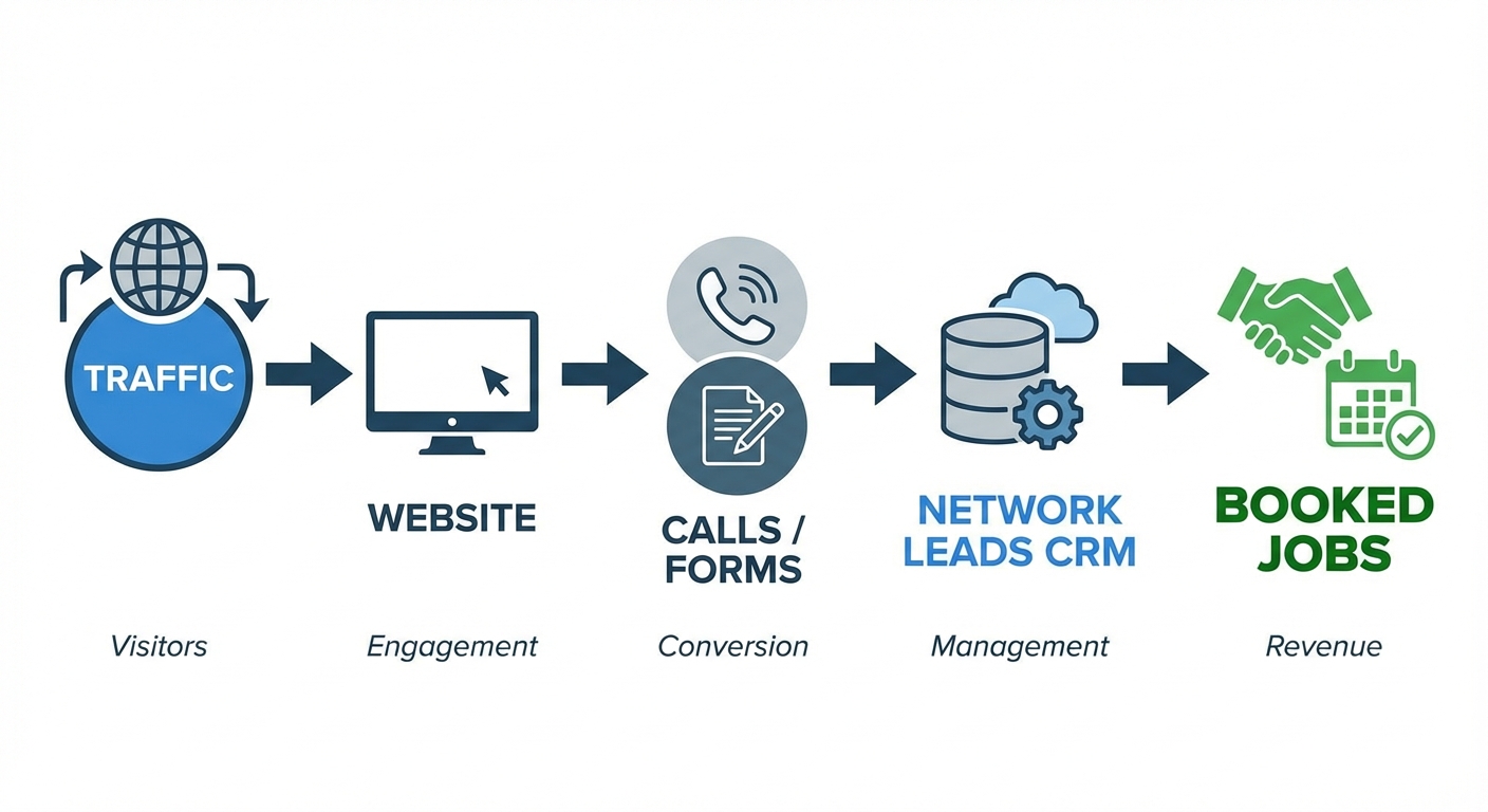 - Website → sends leads into Network Leads